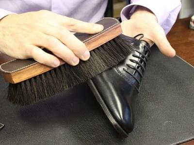 Kế đến, bạn dùng bàn chải lông ngựa đánh đều tay theo 1 chiều và có thể lặp lại quy trình này 2 – 3 lần cho đến khi da giày sáng bóng.
